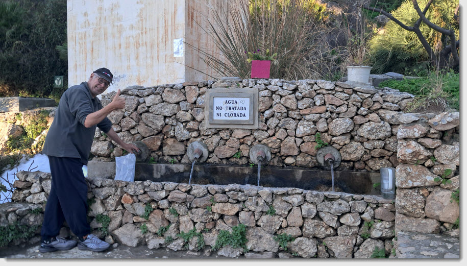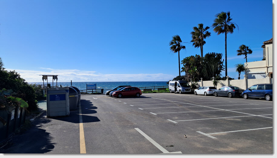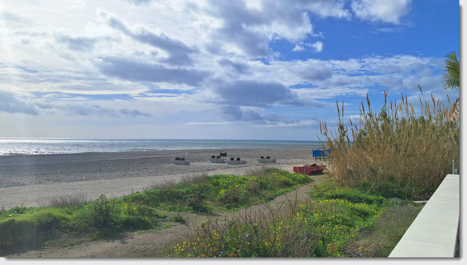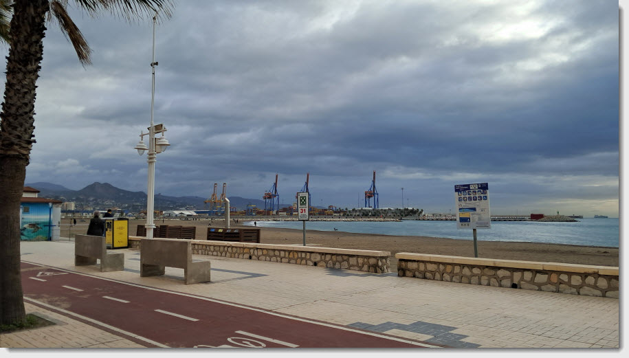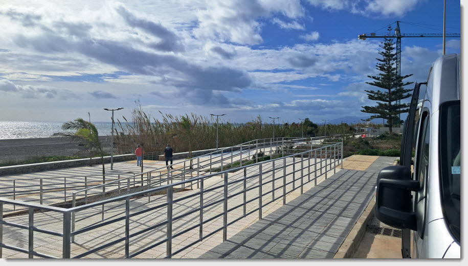 Nous faisons une halte dans une petite ville pour compléter le plein d'eau à un robinet d'un skate-park. Nous laisson ensuite Malaga et Torremolinos sous la grisaille puis de grandes éclaircies arrivent enfin.